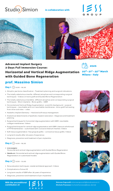 Advanced Implant Surgery and Soft Tissue Management 3 Day Full Immersion Course Horizontal and Vertical Ridge Augmentation with Membranes and Customized Semi-permeable Titanium Meshes Milan, 27-28-29 November 2025 Three days of full immersion with Prof. Massimo Simion with interactive lectures about the most recent techniques for bone regeneration and soft tissue management around dental implants, comprehending a Live Surgery and an Hands-on. Implant site development in cases with bone atrophies, hard and soft tissue defects is actually crucial for a comprehensive implant treatment considering both aesthetic and function. Hard and soft tissues must be considered as a single unit, and the treatment of only one of the two compartments leads to unsatisfactory results on short and long term run. The course will be a complete and practical description of the most up-dated techniques for hard tissue augmentation using GBR with resorbable, non-resorbable membranes and the new customized semipermeable titanium meshes, associated with soft tissue management. REQUEST INFORMATION OR REGISTER NOW If you’d like more information about our training programs, participation details, or if you wish to register for one of the upcoming courses, our team is here for you. Fill out the form below and we’ll get back to you as soon as possible with all necessary information. To request participation, you can also contact us by phone Monday to Friday from 09:00 to 17:30. Simona Capocelli +39 02 66988259 info@studiosimion.it Instagram: massimosimion07